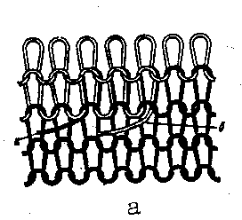 В зависимости от числа игл, на которые одновременно прокладываются нити различных нитеводов, соединительные участки в трикотаже могут состоять из одного, двух или более петельных столбиков. Накладной продольносоединенный трикотаж может быть получен на вязальных машинах, имеющих одно- и двухстороннее направление образования петельных рядов. На машинах с односторонним направлением выработки петельных рядов крайние петли соединительных петельных столбиков в каждом петельном ряду имеют висящие концы нитей, которые возникают из-за обрезки протяжек (на рисунке не показано). Поэтому накладное соединение получают на нескольких (обычно 4-х) иглах, чтобы предотвратить выскальзывание концов обрезанных протяжек из остовов петель. Черезигольный сплит-трикотаж (рис.17) - соединение полос происходит таким образом, что между петельными столбиками из одной нити а ввязываются петельные столбики из другой нити в.