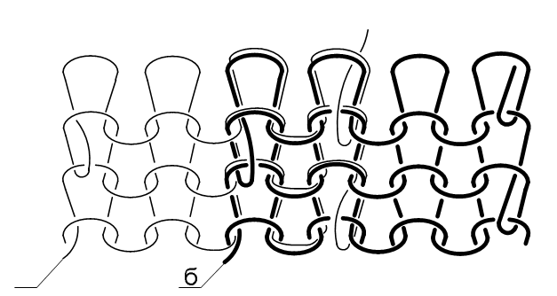 В футерованном продольносоединенном трикотаже (рис. 10) участок соединения смежных полос образован из взаимно переплетающихся набросков На и Нб из нитей а и б.
