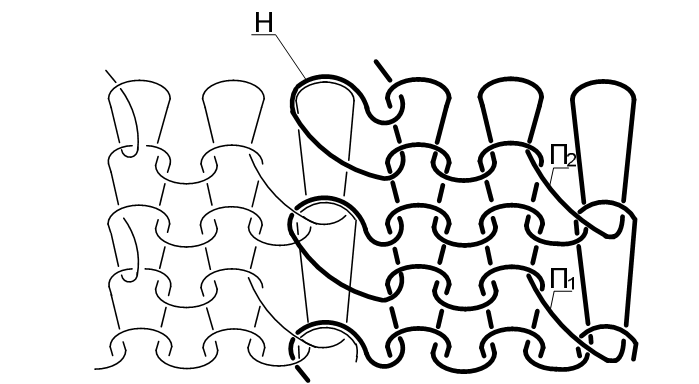 Толщина трикотажа в заходном соединении незначительно отличается от толщины трикотажа в продольных полосах. Прессовый сплит-трикотаж (рис.9). В прессовом продольно соединенном трикотаже участок соединения полос образован петельным столбиком, состоящим из прессовых петель, соединенных с петельными рядами одной полосы – набросками Н, а другой – протяжками П и П. 2