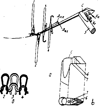 Нитевод имеет два глазка для подачи двух нитей под разными углами. На многосистемных машинах петлеобразующая система имеет малую протяжённость. Резко увеличивается петельный угол подачи нити. Для выполнения основного правила вязания трикотажа платированных переплетений на машине устанавливается нитенаправитель, имеющий ступень 4 и два отверстия 3 и 5. Отверстие 3 служит для выхода ---- платировочной нити Отверстие 5 – для выхода ----грунтовой нити При такой конструкции нитенаправителей платированная нить подаётся под меньшим игольным углом, т.е. ближе к иглам, а грунтовая – под большим игольным углом, чтобы грунтовая нить находилась ближе к крючку иглы, а платировочная дальше: άг<άп,но платировочная нить подаётся под большим углом наклона, чем