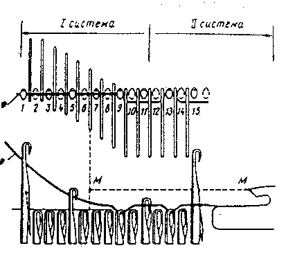 Получив нити, язычковые иглы 4 опускаются и кулируют проложенные на них нити, причем плюшевая нить кулируется на штифтах 1 и ее петли 5 получаются длиннее петель 6 грунтовой нити, кулируемой на отбойном гребне 7 игольного цилиндра. После формирования петель 6 язычковыми иглами штифты отходят к центру игольного диска и сбрасывают с себя плюшевые петли. При вязании гладкого плюша все штифты работают во всех петлеобразующих системах.