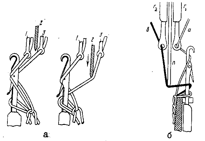 Рис. Получение основовязаного футерованного переплетения на машинах с язычковыми иглами. При одноцикловом способе (Рис а,б)прокладывание на иглы грунтовых и футерных нитей выполняется одновременно в одном цикле п/о (одной п/о системе). При 2- х цикловом способе – футерная и грунтовая нити прокладываются на иглы раздельно в различных циклах п/о (в различных п/о системах). При одноцикловом способе – грунтовая и футерная нити прокладываются на иглы одновременно, после окончания прокладывания футерная нить отводится к старым петлям заключающей планкой. Затем иглы опускаются, образуя петли из нити грунта, осуществляется сбрасывание старых петель и футерной петли. Основным недостатком одноциклового способа с использованием заключающей планки, является возможность сбрасывания с язычков игл не только футерных, но и грунтовых нитей. При 2- х цикловом способе выработки: На о/в машинах с язычковыми иглами – в 1 цикле на иглы прокладывается футерная нить, грунтовая гребенка простаивает, затем футерная нить отводится к старым петлям заключающей планкой. Иглы выстаивают. Во 2 цикле – прокладывается грунтовая нить и образуется грунтовая петля. На о/в машинах с крючковыми иглами – аналогично в 1 цикле прокладывается футерная нить, иглы опускаются, но не прессуются, футерная нить отводится к старым петлям. Во 2-м цикле иглы поднимаются на уровень заключения, на них прокладывается только грунтовая нить, гребенка с футерной нитью простаивает, образуется грунтовая петля. На о/в машинах с пазовыми иглами: 2–х цикловой процесс п/о протекает аналогично предыдущему, но вместо отключающегося пресса применяют механизм отключения замыкателей игл машины. 2–х цикловой способ выработки о/в трикотажа более надежен, чем одноцикловой, при этом можно получить любое сочетание кладок грунтовых и футерных нитей. Трикотаж уточных переплетений Трикотажем уточных переплетений называется трикотаж, содержащий в грунте дополнительные системы нитей, не провязываемые в петли; эти дополнительные нити ввязаны между остовами или между остовами и протяжками. Виды Трикотаж уточных переплетений различают: -по видам грунта, в которые ввязаны уточные нити, - кулирныйили основовязаный одинарный или двойной; -по направлению прокладывания уточных нитей в грунт трикотажа – с поперечными уточными нитями, с продольными уточными нитями, с продольными и поперечныминитями одновременно; -по количеству петельных столбиков, в которые уточная нить проложена в одном петельном ряду; с уточными нитями, проложенными в ограниченном числе петельных столбиков, с уточными нитями, проложенными на всю ширину трикотажного полотна. В трикотаже уточные нити могут выполнять роль связующих, узорных бахромных и подкладочных.
