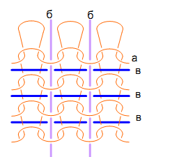 На рисунке показано переплетение нитей в основовязаном трикотаже, где уточные нити а и б выполняют роль связующих и узорных.