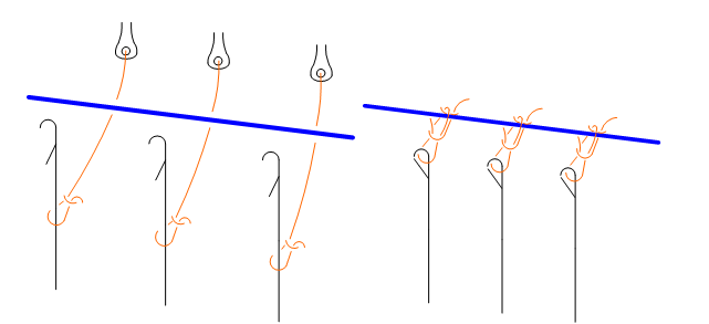 1 – игла поднимается на неполное заключение, старая петля удерживается платиной во второй выемке. Под крючок прокладывается футерная нить в соответствии с раппортом кладки. 2, 3 – игла опускается, под крючком иглы старая петля, удерживающаяся во второй выемке платины и скулированная футерная нить. 4 игла поднимается на полное заключение. Набросок футерной нити удерживается от поднятия платиной в 1-й выемке, старая петля – во 2-й выемке. Прокладывается грунтовая нить. 5, 6 – игла опускается до момента нанесения старой петли. Под крючком иглы изогнутая нить грунта и упавший на нее набросок футерной нити. 7 – игла поднимается на неполное заключение, на язычке иглы изогнутая нить грунта и сброшенный на нее футерный набросок. Под крючок прокладывается платированная нить. 8, 9 – после опускания иглы старая петля сбрасывается на платированную петлю.