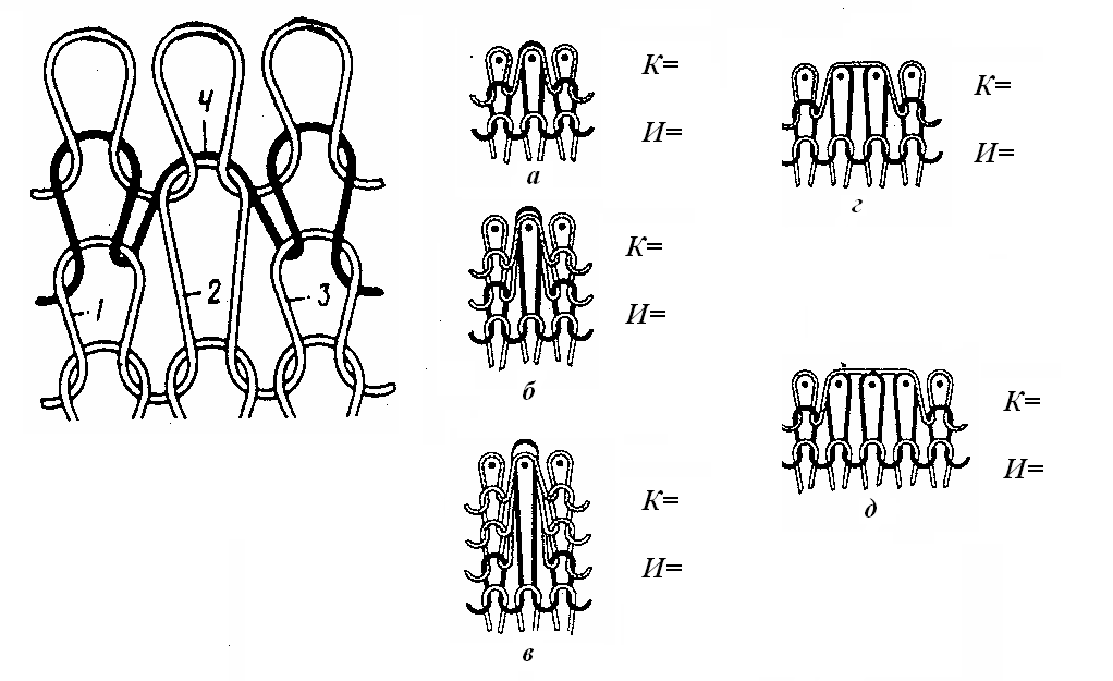 Замкнутая петля 2 и и набросок 4 составляют прессовую петлю. Прессовая петля может иметь один или несколько набросков, количество которых определяет индекс петли k. Рис.1 а – индекс прессовой петли равен k=1 Рис.1б – индекс прессовой петли равен k=2 Рис.1 в – индекс прессовой петли равен k=3 Набросок может быть образован на одной или несколько подряд расположенных петлях, т.е. быть одно--, двух-, трёх-, или многоигольным рис. 1 г, д. В прессовом трикотаже могут сочетаться прессовые петли разного индекса и игольности с петлями базового переплетения. В зависимости от строения прессовых петель может быть регулярным (все прессовые петли с одной стороны имеют одинаковый индекс) и нерегулярным (прессовые петли одной стороны имеют разную структуру: разный индекс или имеет место сочетание прессовых петель и петель базового переплетения).