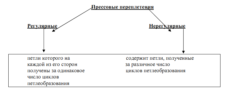 Рисунок 99 – Схема образования уточного основовязаного трикотажа 3) Уточная нить при ее заработке между остовом и протяжкой с лицевой стороны пересекается остовом, а с изнанки – протяжкой. 4) Уточная нить никогда не может пересечь остов петли с лицевой стороны. 5) Если уточная нить не будет прокладываться под иглы, то она ляжет между петельными столбиками и будет видна с лицевой стороны. 6) Если уточные нити будут прокладываться под иглы, но не будут пересекаться нитями грунта или нитями задней гребенки, то они свободно лягут на изнаночной сто- роне. Это происходит тогда, когда обе гребенки сдвигаются при заднем положении на одно и то же число игольных шагов. 7) На двойных машинах нити обоих гребенок могут быть уточными. В основовязаном трикотаже с уточными нитями уточная нить применяется: 1. как связующая – для соединения петельных столбиков между собой; 2. как прокладочная – для образования ворсового трикотажа в виде ватина; 3. как прокладка в любом направлении – для изменения растяжимости или толщины трикотажа; 4. как поперечно-вязанная – для образования бахромы на трикотажном полотне; 5. как протяжка – при периферическом ввязывании уточных нитей с кладкой и без кладки под иглы. 6. как отделочная – для образования рисунков в виде сочетания отрезков уточной нити на изнанке трикотажа, в этом случае изнаночная сторона трикотажа является лицевой стороной изделия. Трикотаж прессовых переплетений Трикотаж, содержащий петли грунта и незамкнутые петли (наброски), образованные из тех нитей, что и петли грунта, называется трикотажем прессовых переплетений. Структурный признак: изменение состава петли. Образован набросок, (наброски). Комплекс прессовой петли.