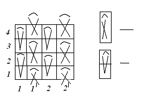 Рис.4 Строение, патрон графические записи одинарного полуфанга Одинарным фангом (рис. 5) называется прессовое переплетение образованное на базе кулирной глади, у которого все петли одинарные, прессовые, иначе индекс всех петель равен К=1