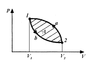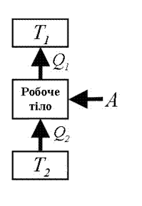 Тепловий двигун характеризується коефіцієнтом корисної дії Температура газу при його стискуванні повинна бути нижча, ніж при розширенні. Тоді тиск газу у всіх проміжних станах при стиску буде менший, ніж при розширенні, і буде виконано умову Якщо здійснити цикл проти годинникової стрілки, то робота буде та сама за абсолютною величиною, але від'ємна (рис.32):