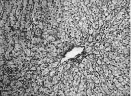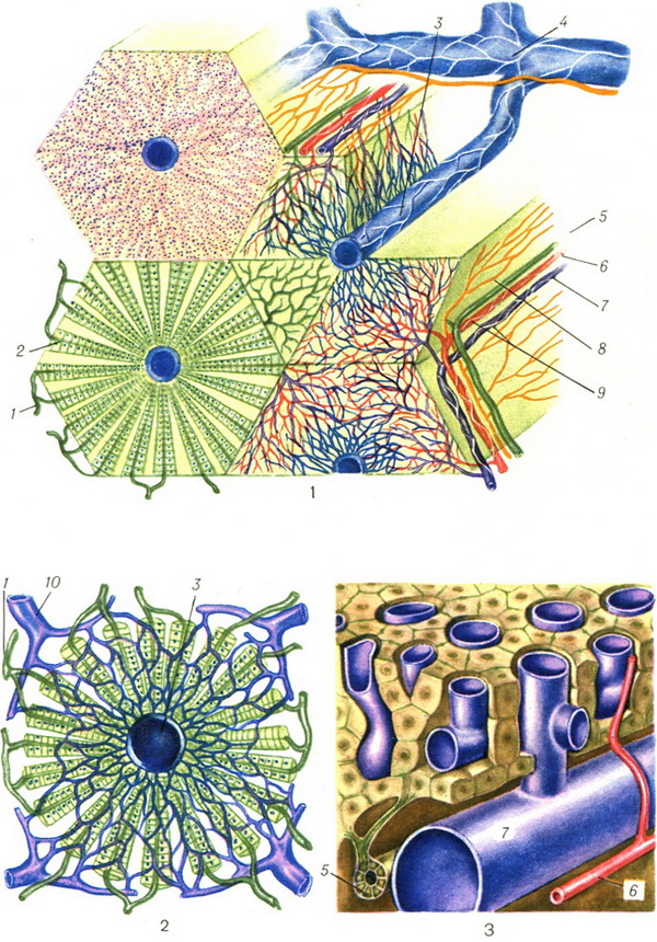 Внутреннее строение печени взрослого человека подчинено архитектонике кровеносного и желчевыводящего русла. Основной структурной единицей П. является печеночная долька. Клетки в ней образуют печеночные балки, расположенные по радиусам. Между балками к центру дольки, где расположена центральная вена, тянутся синусоиды. На периферии дольки из желчных межклеточных капилляров формируются начальные желчные протоки (междольковые). Укрупняясь и сливаясь, они образуют в воротах П. печеночный проток, по которому желчь выходит из печени. По Элиасу (Н. Elias, 1949), печеночная долька построена из системы печеночных пластинок, сходящихся по направлению к центру дольки и состоящих из одного ряда клеток. Между пластинками расположены лакуны, образующие лабиринт (рис. 5).