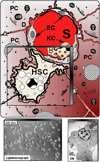 Вверху - схематическое изображение клетки Ито (HSC) по соседству с ближайшими гепатоцитами (PC), ниже синусоидальных эпителиальных клеток печени (EC). S - синусоид печени; KC - клетка Купфера. Внизу слева - клетки Ито в культуре под световым микроскопом. Внизу справа - электронная микроскопия позволяет разглядеть многочисленные жировые вакуоли (L) клеток Ито (HSC), в которых хранятся ретиноиды. Клетки Ито (синонимы: звёздчатая клетка печени, жирозапасающая клетка, липоцит, англ. Hepatic Stellate Cell, HSC, Cell of Ito, Ito cell) — перициты, содержащиеся в перисинусоидальном пространстве печёночной дольки, способные функционировать в двух различных состояниях — спокойном и активированном. Активированные клетки Ито играют главную роль в фиброгенезе — формировании рубцовой ткани при повреждениях печени. В неповрежденной печени, звёздчатые клетки находятся в спокойном состоянии. В таком состоянии клетки имеют несколько выростов, охватывающих синусоидный капилляр. Другой отличительной чертой клеток является присутствие в их цитоплазме запасов витамина А (ретиноида) в форме жировых капель. Спокойные клетки Ито составляют 5-8 % численности всех клеток печени.[1] Выросты клеток Ито подразделяются на два типа: перисинусоидальные (субэндотелиальные) и интергепатоцеллюлярные. Первые выходят из тела клетки и простираются вдоль поверхости синусоидного капилляра, охватывая его тонкими пальцеобразными ответвлениями. Перисинусоидальные выросты покрыты короткими ворсинками и имеют характерные длинные микровыбросы, простирающиеся еще дальше по поверхности эндотелиальной трубки капилляра. Интергепатоцеллюлярные выросты, преодолев пластинку гепатоцитов и достигнув соседнего синусоида, делятся на несколько перисинусоидальных выростов. Таким образом, клетка Ито в среднем охватывает чуть больше двух соседних синусоидов.[2] При повреждении печени клетки Ито переходят в активированное состояние. Активированный фенотип характеризуется пролиферацией, хемотаксисом, сокращаемостью, потерей запасов ретиноида[3] и образованием клеток, напоминающих миофибробластные. Активированные звёздчатые клетки печени также демонстрируют повышенное содержание новых генов, таких как α-SMA, ICAM-1, хемокины и цитокины. Активация свидетельствует о начале ранней стадии фиброгенеза и предшествует повышенному продуцированию ЕСМ-белков. Финальная стадия заживления печени характеризуется усиленным апоптозом активированных клеток Ито, вследствие чего их количество резко сокращается.[4] Для визуализации клеток Ито при микроскопии применяется окрашивание хлоридом золота. Установлено также, что надёжным маркером для дифференциации этих клеток от других миофибробластов является экпрессия ими белка рилин.[5] Date: 2015-09-18; view: 592; Нарушение авторских прав |