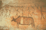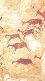 Центральное место в наскальной живописи занимали сцены охоты, в которых охотники и животные связаны энергично разворачивающимся действием.