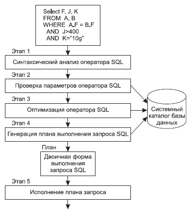 Процесс выполнения операторов SQL может быть условно разделен на 5 этапов.