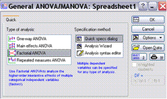 Вставляем данные (все столбцы) в специальную таблицу Spreadsheet (вставка сместе с названиями столбцов). Для расчета нам нужны только первый, третий и четвертый столбцы. Выбираем последовательно разделы Statistics-ANOVA-Factorial ANOVA (как показано на Рисунке 3).