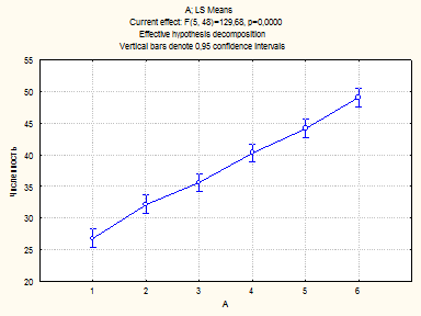Выводы: 1. Так как уровень значимости (p) критерия Фишера в отношении фактора А (глубина) (=129,68) меньше 0,05 (=0,00000) мы отвергаем нулевую гипотезу о случайности различий средних численностей моллюсков на разных глубинах, т.е. достоверно влияние глубины на распределение численности маком. 2. Так как уровень значимости (p) критерия Фишера в отношении фактора В (соленость) (=0,64) больше 0,05 (=0,43) мы принимаем нулевую гипотезу о случайности различий средних численностей моллюсков при разных соленостях, т.е. недостоверно влияние солености на распределение численности маком. 3. Так как уровень значимости (p) критерия Фишера в отношении совместного влияния факторов А и В (=3,88) меньше 0,05 (=0,00000) мы отвергаем нулевую гипотезу о случайности различий средних численностей моллюсков, т.е. достоверно совместное влияние факторов на распределение численности маком.