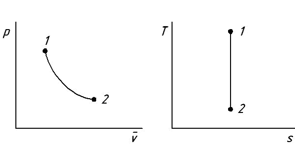 или Справедливость замены Следовательно, в адиабатном процессе работа изменения объема совершается за счет убыли внутренней энергии рабочего тела. 4 и 5. Эти пункты плана в данном случае сводятся к повторению определения процесса: 6. Из уравнения процесса (6.29) вытекает, что адиабата в pv - диаграмме представляет собой дугу кривой линии, соответствующей степенной функции с отрицательным показателем (рис. 6.6). В Ts - диаграмме адиабата изображается отрезком прямой линии, параллельной оси T, как следует из уравнения процесса s=const. Соответствие между направлениями процесса в указанных диаграммах установим с помощью формулы работы (6.31). При возрастании объема работа будет положительной; при этом, по формуле (6.31) должно быть Т1 > Т2. Таким образом, направлению адиабаты в pv -диаграмме вниз соответствует направление в Ts - диаграмме также вниз.
