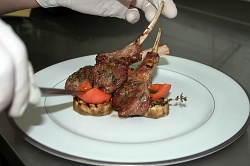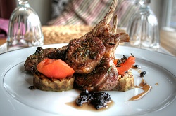 Каре ягненка с печеными баклажанами и томатами конкасе под барбарисовым соусом