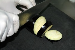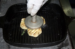 Тепловая обработка. Баклажан и мясо нужно сначала по отдельности слегка обжарить на сковороде-гриль, поэтому для ускорения процесса их желательно под рукой иметь две. На одну из сковородок, смазанную оливковым маслом, выкладываем кружочки баклажана – на пол минутки для каждой стороны. Аромат овощу придаст брошенная за компанию веточка тимьяна и розмарина. Чтобы легкий, волокнистый по структуре баклажан здорово подрумянился и приобрел аппетитный полосатый отпечаток, лучше на время жарки прижать его к сковороде специальным прессом. На готовые баклажанные кружки кладем лодочку помидора конкасе, приправленную сверху смесью базилика с оливковым маслом.