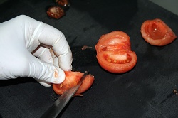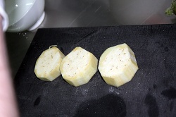 Способ приготовления Баклажан. Режем его на кружочки, толщиной примерно в один сантиметр. Обрезаем шкурку, чтобы не горчила. Солим, немного перчим. Помидор. Чтобы помочь помидору стать «конкасе», вырежем часть, которая крепится к ветке, а на противоположной стороне сделаем крестообразный надрез. На минутку опускаем «краснощекого» в кипяток, после чего легко снимаем с него шкурку, разделываем «обнаженный» помидор на четвертушки, удаляем семена – и помидорная лодочка конкасе готова к большому плаванию. Разве что еще сбрызнем ее слега оливковым маслом.