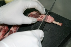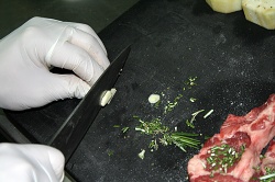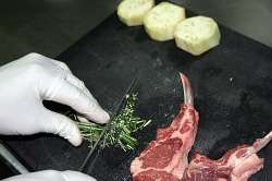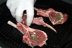 Каре ягненка. Три ребрышка молодого барашка одобрительно и вдохновенно осматриваем, с помощью ножика избавляем от лишнего жира, если таковой присутствует. Мясо солим, перчим с двух сторон, сдабриваем мелко нарезанным розмарином и чесноком.