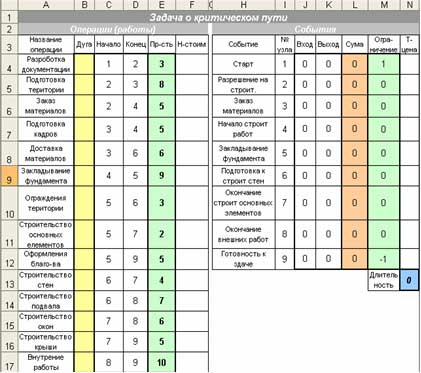 В таблице для событий вычислить суму входящих (Вход) и выходящих (Выход) потоков, их алгебраическую суму (Сума), задать колонку правых ограничений (Ограничения). Для вычисления потока в узлах используют функцию вычисления сумы величин, координаты которых удовлетворяют определенные условия (то есть, если определенная величина принадлежит соответствующему множеству). В Excel такую процедуру исполняет функция =СУММЕСЛИ(). Например, сума входящих потоков узла определяется за формулой =СУММЕСЛИ(Все концы дуг; узел; потоки), то есть, суммируются потоки по тем дугам, концы которых совпадают с поточным узлом. За формулой =СУММЕСЛИ(Все начала дуг; узел; потоки) суммируют выходящие потоки.