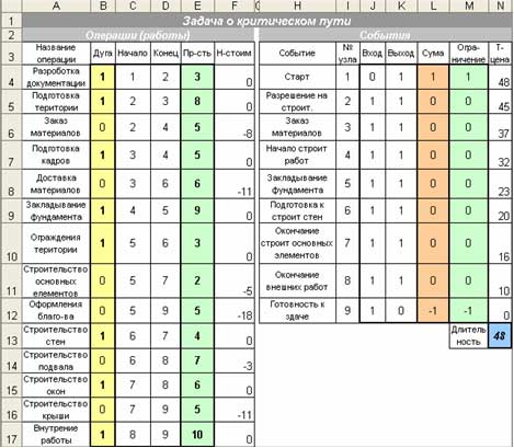 Анализ результата. Найденные критические работы (см. таб.) дают максимальную продолжительность проекта – 48. Нормированные стоимости (Н-стоим) некритических работ указывают на резерв времени. Теневые цены (Т-цена) для узлов-событий определяют частичные критические пути от узла 1 к всем остальным узлам, включительно узел 9.