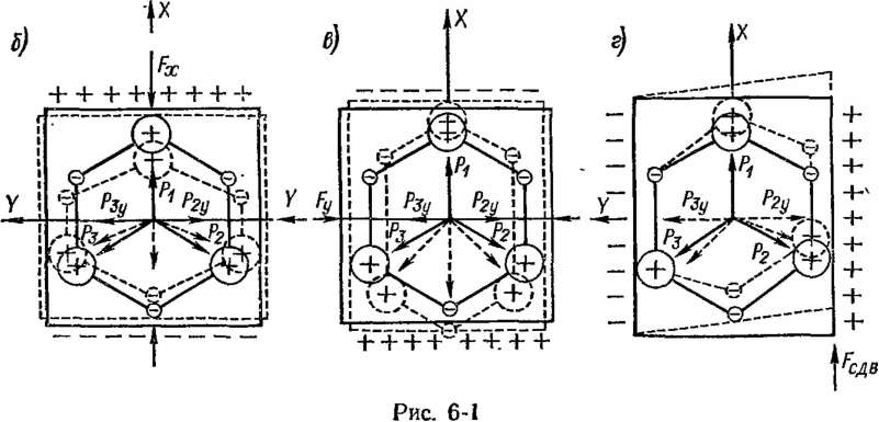 называются электрическими осями или осями X, и по ним направлены векторы поляризации Plf Р2 и Р3. Если к кристаллу кварца вдоль оси приложена сила Fx, равномерно распределенная по грани, перпендикулярной оси X, то в результате деформации элементарной ячейки ее электрическая нейтральность нарушается. При этом, как показано на рис. 6-1,6, в деформированном состоянии ячейки сумма проекций векторов Р2 и Р3 на ось X становится меньше (при сжатии) или больше (при растяжении) вектора Рг. В результате появляется равнодействующая вектора поляризации, ей соответствуют поляризационные заряды на гранях, знаки которых для сжатия показаны на рис. 6-1, б. Нетрудно видеть, что деформация ячейки не влияет на Образование поляризационных зарядов на гранях, перпендикулярных оси X, при действии силы по оси X называется продольным пьезоэффектом. При механических напряжениях, приложенных вдоль одной из осей У (их называют механическими осями), геометрическая сумма проекций векторов Р2 и Р3 на ось У равна нулю, и на гранях пьезо- элемента, перпендикулярных оси У, заряды не образуются. Однако сумма проекций векторов Р2 и Р3 на ось X оказывается не равной вектору Ра. Так, при сжатии пьезоэлемента, как изображено на рис. 6-1, в, указанная сумма превышает Рь в результате на нижней грани образуются положительные заряды, а на верхней — отрицательные. Рассмотренный эффект образования зарядов на гранях перпендикулярных нагружаемым граням, называется поперечным При равномерном нагружении со всех сторон (например, гидростати ческое сжатие) кристалл кварца остается электрически нейтральным, При нагружении по оси Z, перпендикулярной осям X и У и называемой оптической осью кристалла, кристалл кварца также остается электрически нейтральным. При механическом напряжении сдвига, деформирующем ячейку так, как показано на рис. 6-1, в, геометрическая сумма проекций векторов Р2 и Р3 на ось X равна вектору Ри направленному по оси X, и на гранях, перпендикулярных оси X, заряд не возникает. Однако проекции векторов Р2 и Р3 на ось У не равны, и на гранях, перпендикулярных оси У, возникает заряд. Рассмотрение физической природы пьезоэффекта показывает, что при напряженном состояний материала заряды принципиально могут возникать между тремя парами граней. Таким образом, поляризационный заряд является вектором и описывается тремя компонентами. Напряженное состояние характеризуется тензором второго ранга с девятью компонентами (см. § 4-5). Пьезоэлектрический модуль, определяющий зависимости заряда от напряженного состояния, является тензором третьего ранга и определяется 27 компонентами.