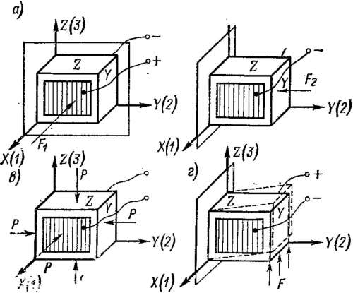 Наличие полярных направлений в пьезоэлектриках (см. рис. 6-1, а) объясняет важность определенной ориентации граней пьезоэлемента относительно кристаллографических осей кристалла X, Y и Z. Форма