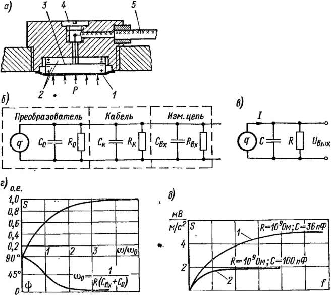 Устройство и измерительные цепи. На рис. 6-5, а схематически изображено устройство пьезоэлектрического преобразователя. Изме Выходная мощность пьезоэлектрических преобразователей очень мала, поэтому на выходе преобразователя должен быть включен усилитель с возможно большим входным сопротивлением. Эквивалентная схема преобразователя, соединенного кабелем с измерительной цепью, представлена на рис. 6-5, б, на котором С0 — емкость между гранями пьезоэлектрика (емкость преобразователя); Ск — емкость кабеля между жилой и экраном и Свх — входная емкость измерительной цепи; R0—сопротивление преобразователя; RK — сопротивление изоляции кабеля; Rrx — входное сопротивление измерительной цепи. Эквивалентную схему можно упростить согласно рис.6-5, в, где сопротивление R равно сопротивлению параллельного соединения /?0> RK и /?вх и емкость С= С0 + Ск+ Свх.