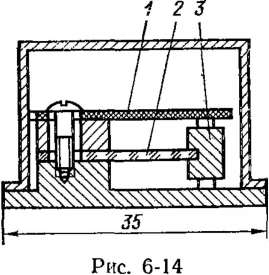 При работе ЭС преобразователей на постоянном токе нужно учитывать существующую между электродами контактную разность потенциалов (КРП), включаемую в эквивалентной схеме последовательно с емкостью. КРП зависит от природы материалов, свойств и чистоты поверхности и существует даже между электродами, выполненными из одного и того же материала. Так, между электродами, выполненными из алюминия высокой чистоты, КРП может достигать 1 В. Лишь применение специальных мер позволяет снизить КРП до значения 10—20 мВ. Допустимое напряжение на конденсаторе определяется значением напряженности, при которой наступает пробой воздушного промежутка. Для воздуха при нормальном давлении и зазорах между пластинами 0,1—10 мм эта напряженность составляет 2—3 кВ/мм. При зазорах, меньших 0,1 мм, можно не снижать напряжения, так как при напряжениях, меньших 350 В, воздушный промежуток вообще не пробивается независимо от длины зазора. В ряде случаев напряжение питания ограничивается допустимыми силами электростатического притяжения между пластинами. В- одинарном преобразователе при диаметре пластины d = 25 мм, зазоре 6 = 0,1 мм и напряжении U = 50 В значение электростатической силы достигает f9C = U4S/ (26)2 = 6-10"4 Н. В дифференциальном преобразователе с переменным зазором (см. рис. 7-9, д), силы, действующие между парами пластин, направлены встречно и компенсируют друг друга. Однако полная компенсация возможна только, если входное сопротивление цепи, включенной в диагональ моста, бесконечно велико и рабочие емкости ничем не шунтируются. В этом случае уменьшение или увеличение зазора вызывает пропорциональное уменьшение или увеличение напряжения между соответствующими пластинами; сила, действующая между ними, остается неизменной, т. е. разность сил равна нулю независимо от перемещения средней пластины. Зависимость емкости от внешних условий. Относительное изменение емкости С = е5/б определяется как ус = уе + ys — Ye- Площадь как правило, определяется линейными размерами, составляющими 10—100 мм, и изменение этих размеров на 0,1—1 мкм вызывает пренебрежимо малое изменение площади S и емкости С. Зазор б в ЭС преобразователях составляет 10 мкм — 1 мм, и его из-. 2 1 менения даже на 0,1 мкм могут вы- рис 7_3 звать существенную погрешность. Поэтому при конструировании ЭС преобразователей должны быть тщательно продуманы вопросы крепления электродов и защиты от выпадения на рабочих плоскостях электродов каких-либо осадков (герметизация, вакуумирование и т. д.). Одной из основных причин изменения зазора является изменение геометрических размеров, вызываемых линейным расширением материалов под действием температуры. В качестве примера на рис. 7-3 показан емкостный преобразователь для измерения давления. Подвижной пластиной 1 преобразователя служит мембрана, припаянная к латунному корпусу, который ввинчивается в полость, где измеряется Давление. Неподвижная пластина 2 выполнена в виде тонкой медной фольги, наклеенной на кварцевый изолятор. Зазор между пластинами составляет 20 мкм. Толщина кварцевой пластины 3 мм. Коэффициент линейного расширения (КЛР) для латуни, равен 18,9-10~6 К-1, Для кварца 0,5-10~6 К-1. Увеличение зазора при увеличении температуры на один градус составляет Дб = (18,9 -Ь 0,5) Ю"6-3* 10~3 = 55,2-10~9 м = = 0,05 мкм. Полагая, что изменение зазора при действии номинального давления равно 10 мкм, можно