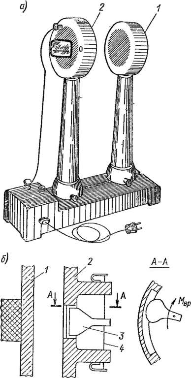 Вследствие того что вращающие моменты электростатических измерительных механизмов очень малы, для всех конструкций характерен световой отсчет (стрелка в виде луча света) и крепление подвижной части на растяжках, причем одна из растяжек используется как токоподвод к подвижному электроду. В приборах применяются как воздушные, так и магнитоиндукционные успокоители, хотя в отдельных случаях достаточное успокоение создается уже самим подвижным электродом при движении его в узком зазоре между неподвижными электродами. Очень большое внимание при конструировании уделяется стабильности размеров, которые определяют геометрические параметры, входящие в выражение для вращающего момента. Наконец, ЭС преобразователь должен быть защищен от внешних электрических полей, поэтому в электростатических приборах, применяется либо специальный экран, либо металлический корпус. Форма электродов, приведенная на рис. 7-4, используется в вольтметрах с пределами измерения до 1 кВ. Совершенно особую конст- - рукцию имеют ЭС преобразователи, к которым подается напряжение 10—100 кВ. Внешний вид такого прибора и схематическая конструкция механизма показаны на рис. 7-5. Высоковольтный потенциальный электрод 7, размеры и форма которого рассчитываются из условий электрической прочности, закреплен на опорном изоляторе и находится на некотором расстоянии от второго электрода 2 (рис. 7-5, а). В электроде 2, который служит экраном, расположена подвижная часть и шкала измерительного механизма. Экран 2 электрически соединен с подвижным электродом 3, закрепленным на растяжках 4 (рис. 7-5, б). В экране, в области электрода 3, сделаны окна, форма и размер которых определяют шкалу измерительного прибора, так как только через эти окна электростатическое поле электрода 1 проникает через экран 2 и взаимодействует с подвижным электродом 3, создавая вращающий момент.