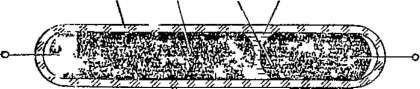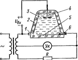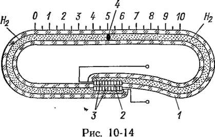 На рис. 10-14 показано устройство водородного кулонометриче- ского преобразователя, применяемого для интегрирования токов и напряжений. Интегратор представляет собой герметичный стеклянный сосуд разделенный на две части пористой стеклянной перегородкой 2, пропитанной эле гетр о литом. По обе стороны перегородки укреплены сетчатые электроды 3 из платины. В горизонтальной трубке находится капля электролита 4, которая является указателем и разделяет преобразователь на две части, заполненные водородом. Ток, протекающий между электродами, вызывает выделение водорода на катоде (2Н+ -f 2е Н2) и поглощение такого же количества водорода на аноде (Н2 ->- 2Н+ + 2е). Это приводит к разности давлений в камерах и перемещению указателя 4. Такие кулонометрические интеграторы (Х-15 и Х-603) обеспечив вают интегрирование токов от 1СГ8 до 10~2 А с погрешностью 0,5—1% и напряжений от Ю-5 до 4-1СГ2 В с погрешностью 1,5—2%. Рабочий диапазон температур от —30 до +80 °С. Температурная погрешность при интегрировании токов составляет 0,01—0,05 %/К, а при интегрировании напряжений 1,5 %/К- Предел измерения по количеству электричества равен 18 Кл. Кулонометрический управляемый резистор (мимистор) (рис. 10-15) представляет собой герметичный корпус 2, заполненный электролитом 3, содержащим ионы металла, из которого изготовлен управляющий электрод (анод) 4. Собственно резистивный элемент 5, являющийся катодом, выполнен в виде тонкой пленки из инертного металла или угля. Он имеет два вывода / и 6, сопротивление между которыми измеряется на переменном токе. При включении постоянного тока между анодом и катодом металл анода растворяется в электролите и такое же количество металла осаждается на катоде, уменьшая сопротивление между выводами 1 и 6. Из выражения (10-17) можно получить уравнение преобразователя управляемого резистора
