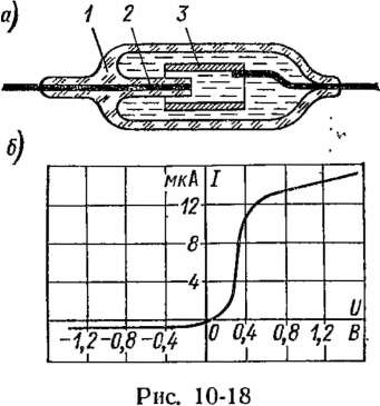 При подаче на преобразователь возрастающего напряжения вначале через него идет только остаточный ток /0, обусловленный разрядом небольшого числа ионов всех видов. При достижении напряжением значения потенциала разряда ионов РЬ++ (—0,45 В) ток через преобразователь резко возрастает и достигает значения /п1, определяемого концентрацией ионов РЬ++ в растворе. При дальнейшем росте напряжения ток остается равным /п1 до тех пор, пока не будет достигнут потенциал разряда ионов Cd++ (—0,6 В), и затем ток снова резко возрастет до значения /п2. При этом разность токов /п2 — соответствует концентрации в растворе ионов Cd++ и т. д„ , Потенциалы «полуволн» различных элементов образуют так называемый полярографический спектр, и их значения приведены в специальных таблицах. Сравнивая потенциалы «полуволн», полученные при исследовании неизвестного раствора, с табличными данными, можно установить химический состав исследуемого раствора,.а по скачкам тока — концентрацию отдельных компонентов. К недостаткам ртутного электрода относятся: ядовитость ртути, невозможность исследования расплавленных солей, небольшое допустимое напряжение анодной поляризации (до -1-0,4 В). Последнее обусловлено электрохимической реакцией растворения ртути (окисление ртути), что не дает возможности производить анализ веществ, окисляющихся труднее ртути, т. е. при положительных потенциалах больше +0,4 В. По этим причинам начинают применяться полярографические преобразователи с твердыми электродами из платины, золота, серебра, никеля и др. Для получения тонкого диффузионного слоя электролита у электрода и обновления этого слоя используются вращающиеся по окружности или вибрирующие твердые электроды. При этом также увеличивается чувствительность преобразователя вследствие усиления диффузии вещества к электроду. 10-6. ИОНИСТОРЫ Ионисторы — это разновидность электрохимических преобразователей, основанных, подобно полупроводниковым транзисторам, на использовании запирающего слоя, обедненного носителями электрических зарядов. Такой слой можно получить в электролитах, содержащих как окисленные, так и восстановленные формы определенных иоиов, например 1~/1, Fe+++/Fe++ и др. На' рис. 10-18, а и б показаны устройство и статическая вольт-амперная характеристика электрохимического диода. Диод состоит из герметичного корпуса /, заполненного водным раствором KI с небольшой добавкой иода, который в присутствии ионов I" может существовать в растворе только в виде трехиодных ионов При этом концентрация ионов 1.7 на два-три порядка меньше концентрации ионов I". Такой электролит совместно с инертными электродами 2 и 3 образует обратную окислительно-восстановительную систему. Одним из электродов является торец тонкой платиновой проволоки 2 (микроэлектрод), а другим — цилиндр из платиновой фольги 3. При отрицательной полярности микроэлектрода, когда он является катодом, на нем восстанавливаются окисленные ионы I.7 (I^ + 2е -^31"), концентрация которых мала, и у этого электрода образуется запирающий слой, поэтому диод закрыт. При положительной полярности микроэлектрода, когда он является анодом, на нем происходит окисление ионов I~(3Ig 2е), концентрация которых ве