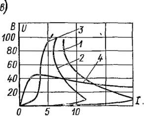 Один из возможных вариантов цепи с источником тока и четырех - проводной соединительной линии показан на рис. 11-15, б. Источник тока здесь построен на основе операционного усилителя ОУ1 и резисторов с сопротивлениями R^ — R^. Как известно [1], если в такой цепи установить RJR3 = R*/Rи то ток /0, поступающий в терморези Операционный усилитель ОУ2 обеспечивает поддержание нулевого потенциала на нижнем зажиме терморезистора Re вне зависимости от сопротивления проводов г3 и г4. Благодаря этому напряжение между проводом г2 и землей оказывается пропорциональным Re и отпадает необходимость в использовании дифференциального усилителя. Построенный на основе операционного усилителя ОУЗ неинвер- тирующий усилитель обеспечивает выходное напряжение, равное Если требуется, чтобы при начальном значении сопротивления терморезистора Rq — R0 обеспечивалось равенство выходного напряжения UBUK нулю, то отношение R6/R5 следует выбирать в соответствии с равенством RG/Rb = R0KR3 — Ro)- Тогда UBblx = - U0 (Re-RoViRs-Ro)- Вводя в измерительную цепь (рис, 11-15,6) резистор R7l можно скорректировать в некоторых пределах нелинейность преобразования температуры в сопротивление /?© (если таковая нелинейность имеется). При введении R7 нужно скорректировать значения сопротивлений Rt — /?4 так, чтобы выполнялось равенство RA (R3 + R7)/(R3R7) = = RJRx. При этом ток /0 оказывается равным /0 — U0/R3 + ^вых/^7. Подставляя в выражение (11-7) найденные значения /0 и /?6//?5, получим соотношение V»*-= Re +) (1 + ", из которого определим £/вых как г] ___ т 1 ______ Re~Ro _________ ивых и0 р R о -j. Подобным путем при правильном выборе элементов цепи удается скорректировать погрешность линейности платинового термометра сопротивления и уменьшить эту погрешность в диапазоне измерения О—400 °С до значения 0,1—0,2 °С. Без линеаризации погрешность линейности составляет около 8 °С. Полупроводниковые терморезисторы имеют весьма нелинейную зависимость сопротивления от температуры (кривая 1 на рис. 11-16, а). Для полупроводниковых терморезисторов разработаны специальные линеаризующие цепи. Простейшая из таких цепей образуется при шунтировании полупроводникового терморезистора постоянным сопротивлением, как это показано на рис. 11-16,6. Линеаризованное сопротивление R'e = = ReRif(R& + #1) изменяется в зависимости от температуры в соответствии с кривой 2 на рис. 11-16, а. Для того чтобы получить точку перегиба кривой 2 при заданной температуре Та (Тп целесообразно Rl = RTjB-2Tn)/(B + 2Tn), где Тп — абсолютная температура, К; Rr — сопротивление терморезистора, соответствующее температуре Тп.