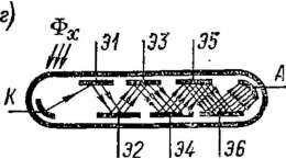 Отношение тока, усиленного за счет ионизации, к первичному фототоку называется коэффициентом газового усиления и может достигать 6—7. Соответственно этому чувствительность газовых фотоэлементов составляет 5ф = 100 -f- 250 мкА/лм (табл. 12-6). Из приведенных на рис. 12-LI, в вольт-амперных характеристик следует, что чувствительность газовых фотоэлементов весьма сильно зависит от напряжения питания, которое должно стабилизироваться и не превышать 100—240 В, ибо выше этих значений начинается область самостоятельного разряда. В газовых фотоэлементах максимальная амплитуда фототока достигается лишь через некоторое время после начала освещения (по мере развития газового разряда). Поэтому газовые фотоэлементы применяются для регистрации световых потоков с частотами не выше нескольких сотен герц. Фотоумножители. В фотоумножителях для усиления первичного фототока используется вторичная электронная эмиссия. Для этого в фотоумножителях (рис. 12-11, г), помимо фотокатода К н анода А, вводятся вторичные катоды (эмиттеры) Э и системы фокусировки электронного пучка. Коэффициент вторичлой эмиссии может составлять 2,5—4. Общий коэффициент усиления в многокаскадных фотоумножителях достигает сотен тысяч. Выходной ток фотоумножителей может достигать 1 мА. Явление вторичной электронной эмиссии практически безынерционно, поэтому фотоумножители, как и вакуумные фотоэлементы, могут использоваться для регистрации весьма быстро протекающих процессов. Параметры некоторых фотоумножителей приведены в качестве примера в табл. 12-6.