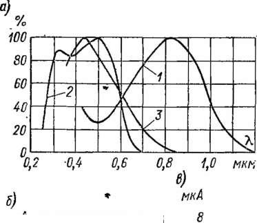 Температура окружающей среды влияет на значения флуктуациоиных помех, темнового тока и чувствительности ФП, и для некоторых типов ФП, в особенности подверженных действию температуры (фоторезисторы), в паспорте приводятся и температурные характеристики. Фотоэлементы с внешним фотоэффектом — это вакуумные и газонаполненные фотоэлементы и фотоумножители. Принцип действия этих фотоэлементов заключается в том, что кванты света, достигая поверхности фотокатода, выбивают электроны, которые увлекаются внешним электрическим полем и создают фототок. Электрон может покинуть катод, лишь если энергия фотона больше работы выхода, т. е. heIX А, где h — постоянная Планка. Значение А зависит от химической природы и состояния поверхности. Таким образом, для каждого типа фотокатода существует длинноволновая, или красная, граница спектральной чувствительности, определяемая длиной волны = k!(hc). Спектральные^ характеристики вакуумных газонаполненных фотоэлементов и фотоумножителей целиком определяются свойствами фотокатодов. На рис. 12-11, а приведены такие характеристики для наиболее распространенных серебрянок ислородноцезиевого (кривая)), су- рьмяноцезиевого (кривая 2) и миогоще- лочного (кривая 3) фотокатодов.