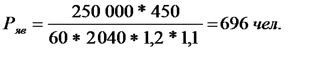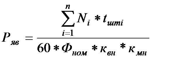 где Ряв – явочная численность основных рабочих, чел.; Ni – количество i -ых изделий, выпускаемых за год, шт.; tштi – норма времени на изготовление i -ого изделия, мин.; 1/60 – коэффициент перевода минут в часы; Фном – номинальный годовой фонд времени работы одного рабочего (без учёта потерь рабочего времени), 2040 ч.; квн – коэффициент выполнения норм выработки; кмн – коэффициент многостаночного обслуживания.