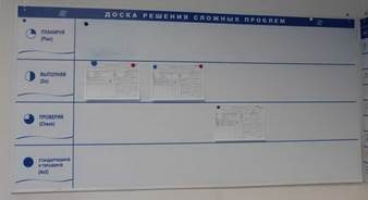 Третий элемент системы – Доска решения сложных задач. Это мощный инструмент, позволяющий формировать кроссфункциональные команды и решать сложные комплексные задачи на основе проектного подхода. В основе данного элемента лежат не только базовые принципы решения проблем (такие как 5 WHY и PDCA), но и более продвинутые техники (например, Диаграмма Ишикавы). Для решения задачи используется специальный бланк, позволяющий на листе формата А4 проследить весь цикл жизни проекта от определения проблемы и ее причин, до внедрения стандарта и обучения сотрудников.