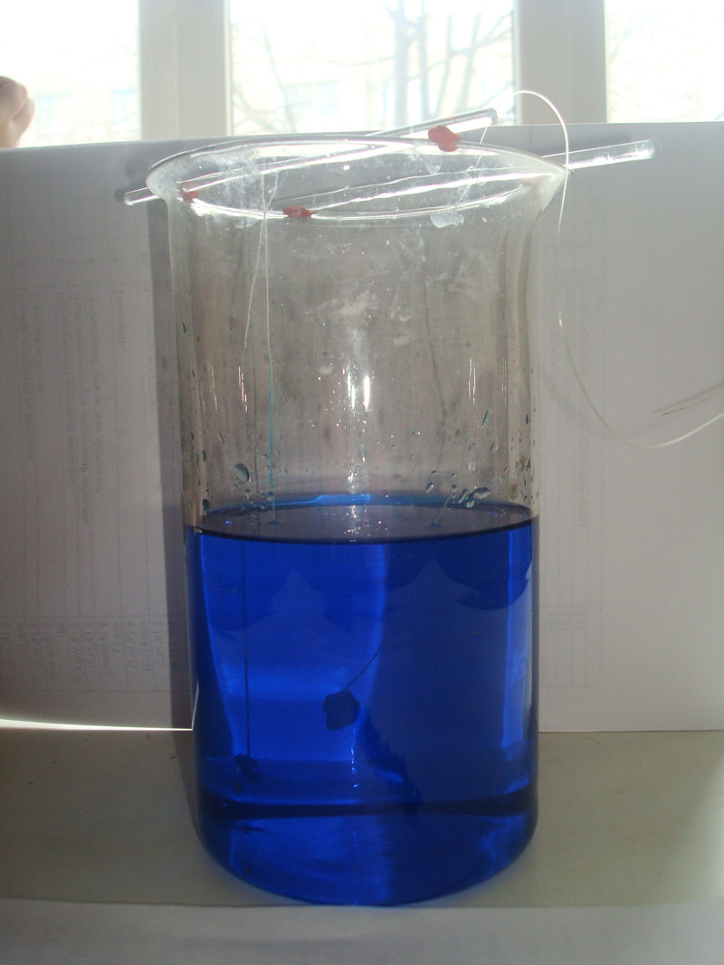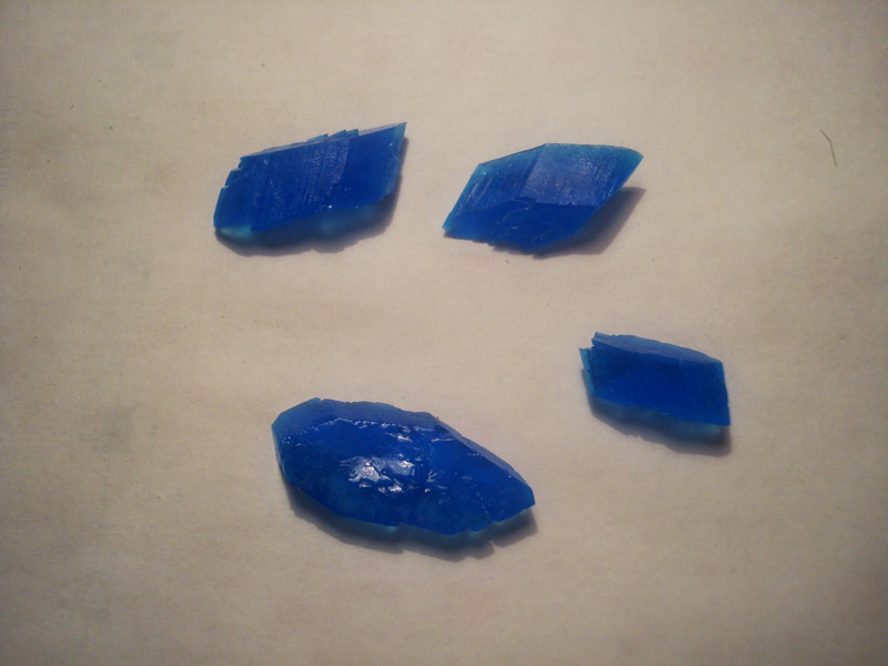 Разница на лицо! Итак, сульфат меди у нас есть. Теперь ищем емкость, в которой мы будем выращивать кристаллы. Подойдет любая стеклянная или (лучше) пластмассовая. В пластмассе кристаллы не никогда прирастают, в отличие от стекла. Если посуда стеклянная, она должна быть только тонкостенной. Толстостенные экземпляры могут лопнуть от горячего раствора. Если у вас напряги с хим посудой — не беда, можно использовать хоть одноразовые стаканчики. Внимание — есть потом из этой посуды строго запрещено!!! Затем мы берем емкость и насыпаем туда наш медный купорос. Сильно много не сыпьте, для первого раза грамм 70-100 с лихвой хватит. Заливаем его горячей водой (в идеале дистиллированной, но это совсем не обязательно). Затем есть два пути. Для выращивания кристаллов нам нужна затравка — маленький кристаллик, который и будет расти. Сколько затравок — столько получится и кристаллов. Для этого воды много не льем, постоянно перемешиваем раствор. Раствор должен быть таким насыщенным, чтобы последние крупинки вещества на дне емкости не растворялись. Фильтруем раствор горячим и ставим в прохладное место, крышкой не накрываем. На следующий день на дне емкости выпадает куча маленьких кристалликов. Отбираете несколько самых больших и ровных, либо тех, которые вам понравились. Раствор для выращивания кристаллов готовится почти таким же образом, но есть и отличия. Воды в раствор надо долить немного побольше, дать ему остыть и уже затем профильтровать. Затравка и раствор у нас есть. Споласкиваем затравку под проточной водой (руками трогать её не желательно, во-первых медный купорос не самое полезное вещество, а во-вторых на ней останутся следы от пальцев, и кристалл будет расти неправильной формы). После этого аккуратно помещаем затравку в емкость с остывшим и профильтрованным раствором. Можно положить её на дно, но тогда кристалл будет расти только в длину и в ширину. Лучше подвесить её на леску (если использовать нитку, то на нитке может нарасти куча мелких кристалликов, а на леске — нет), второй конец лески привязать к карандашу или другому подобному предмету и поместить кристалл в раствор. Отрегулировать длину лески так, чтобы затравка висела в середине раствора. Теперь кристаллик будет равномерно расти со всех сторон. Емкость поместить в место, не поверженное влиянию температур и накрыть листком бумаги (если использовать картон, то маленький кристалл будет расти несколько месяцев, с бумагой же — всего пару недель). Раз в одну-две недели фильтровать раствор от выпадающих кристалликов. В результате вырастают красивые голубовато-синие кристаллы, с гранями, по форме напоминающими параллелограмм. Когда они вырастут подходящего размера, их можно вытащить, сполоснуть с проточной воде, протереть салфеткой и покрыть одним-двумя слоями прозрачного лака (хоть для ногтей). Теперь наш кристалл можно свободно брать в руки, мочить в воде, и ему ничего не будет — пару слоев лака вполне достаточно. Единственное но — кристаллы по-прежнему хрупкие. Так что аккуратнее с ними! Фото моих кристаллов:
