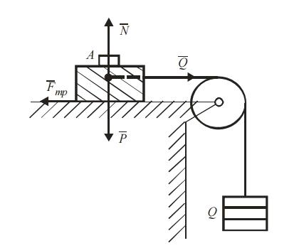 При рівновазі тіла A, розміщеного на шорсткій поверхні, рушійна сила Q врівноважується силою тертя Fтр, поява якої обумовлена шорсткістю поверхні і наявністю зчеплення з поверхнею тіла, притиснутого силою ваги P до поверхні. Поступово нарощуючи вагу вантажу Q і таким чином збільшуючи силу Q при одному і тому ж нормальному тиску P, можливо досягти того навантаження Qmax, при якому тіло A зрушиться з місця. Очевидно, буде досягнуто граничне положення, при якому сила тертя стане найбільшою (Fтр = Fmax) і не зможе зрівноважувати силу Q при її подальшому збільшенні. Змінюючи нормальний тиск P шляхом навантаження тіла A допоміжними гирьками можна дослідити, як змінюється при цьому гранична сила тертя Fmax. Ці та інші досліди дозволяють підтвердити такі закони Кулона для сухого тертя ковзання: