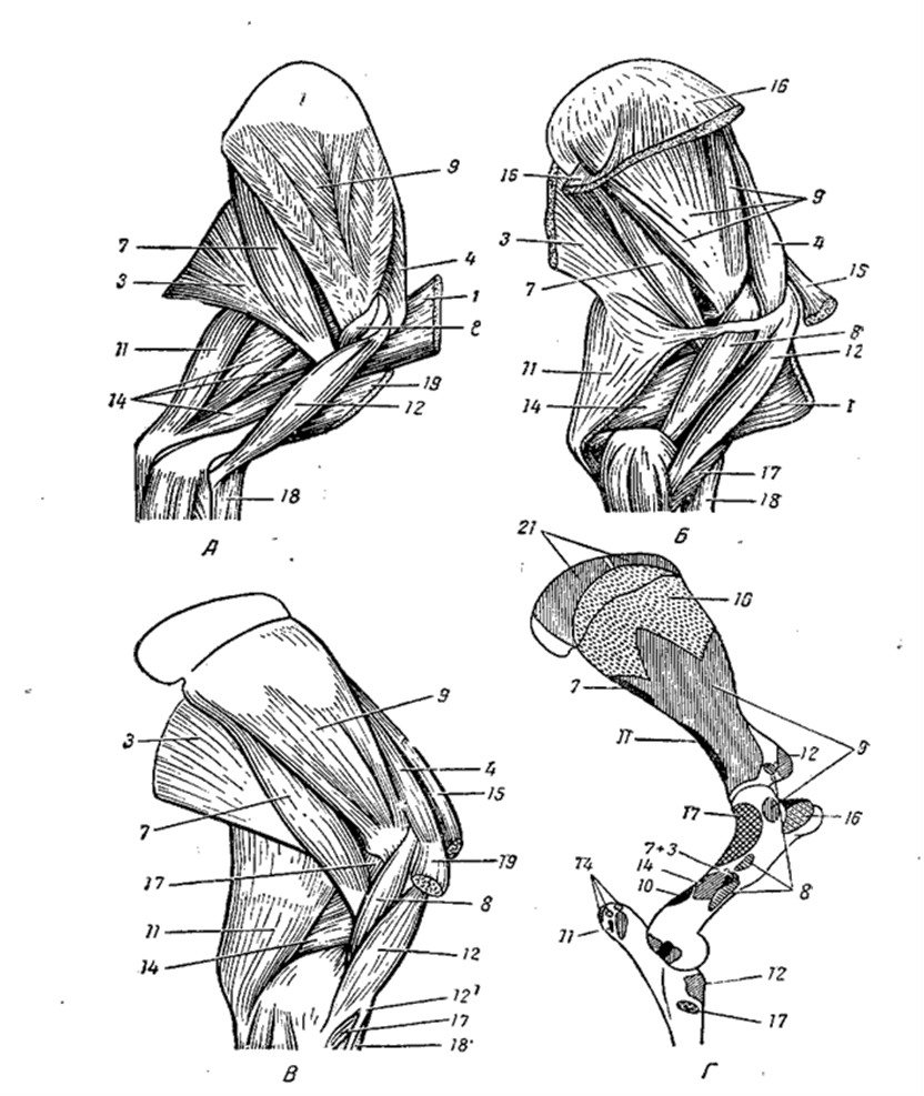 Рис.2. Мышцы лопатки и плеча с латеральной поверхности: А — собаки; Б — лошади; В — схема закрепления мышц на костях. 1 — плечеголовная мышца; 2 — трапецевидная м.;3 – широчайшая м. спины; 4 — предосная м.; 5 — заостная м; 6 — малая круглая м.; 7 — большая круглая м; 8 – клювовидно-плечевая м.; 9 – подлопаточная м.;10 — локтевая м.; 11 – напрягатель фасции предплечья 12 — двуглавая м. плеча; 13 — дельтовидная м., ее лопаточная часть; 13'— дельтовидная м., ее акромиальная часть; 14 —трехглавая м. плеча, ее длинная головка; и14'—ее латеральная головка; 16 – зубчатая вентральная м.; 17 — плечевая м.; 18— лучевой сгибатель запястья.