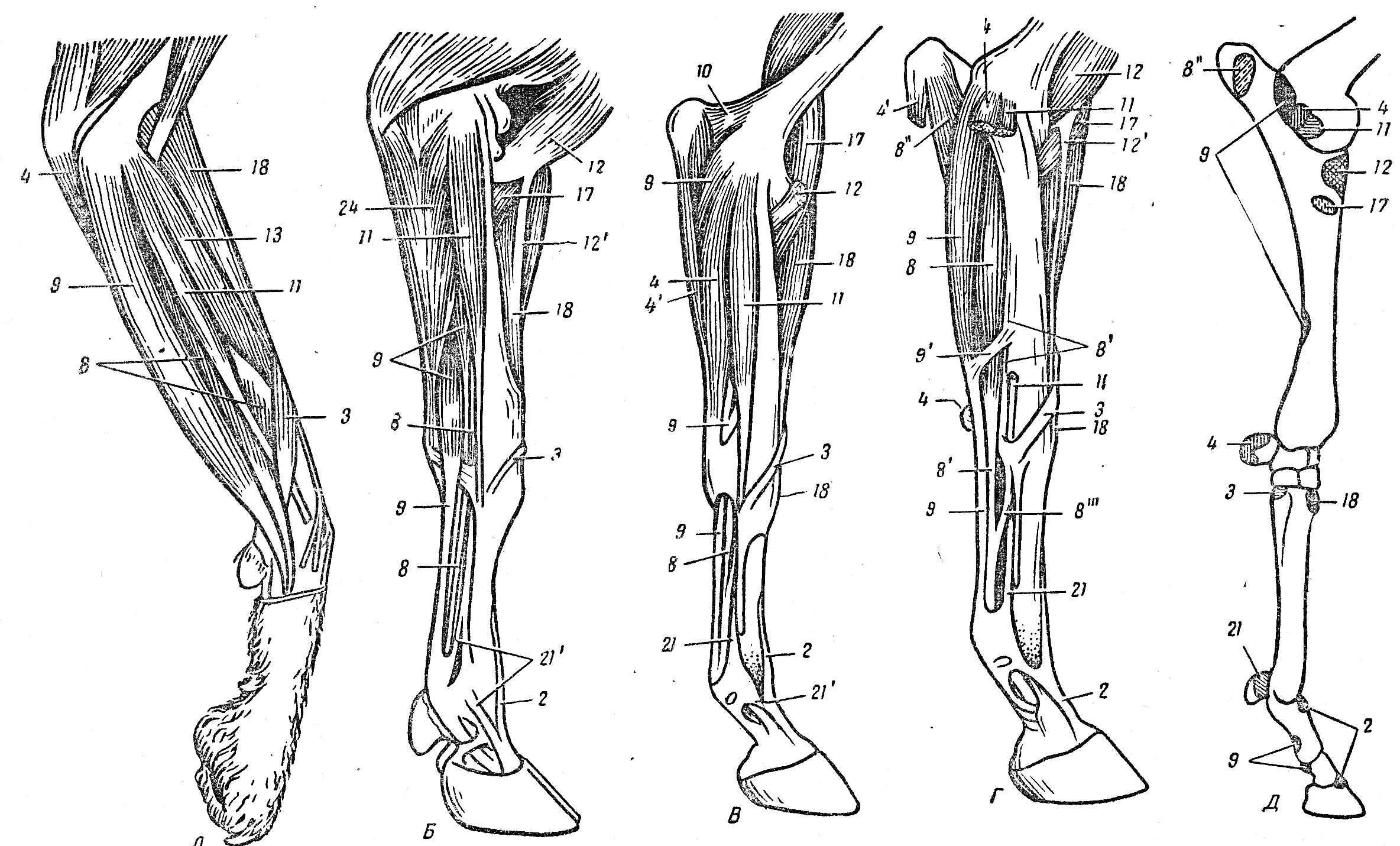 А – Б – собаки; В – свиньи; Г - коровы; Д – лошади; Е – закрепление мышц на костях. 1 – боковой разгибатель пальцев, 2- общий разгибатель пальцев, 3- длинный абдуктор большого пальца, 4 – локтевой сгибатель запястья, 5 – лучевой разгибатель запястья, 6 – разгибатель 3-го пальца, 7 – разгибатель 4-го пальца, 8 – глубокий сгибатель пальцев, 9 – поверхностный сгибатель пальцев, 10 – локтевая мышца, 17 – плечевая м., 18 – лучевой разгибатель запястья, 21 – межкостный мускул, 21/ - ее сухожилие к общему разгибателю пальцев.