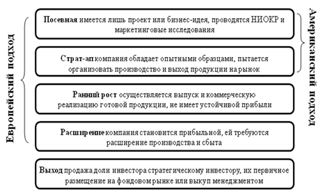 В российской экономической практике венчурные фонды осуществляют инвестиции не только в предприятия, находящиеся на ранних этапах развития, но и в предприятия на стадии расширения бизнеса и реструктуризации. Данная особенность имеет место в связи с тем, что в России рисковыми можно назвать все этапы инвестиционной деятельности, а вложение средств в компании на стадии расширения чаще оказывается более доходным, чем на начальных стадиях проекта [20]. Таким образом, для России ближе европейский подход к определению венчурного капитала. По нашему мнению, это обусловлено несколькими причинами, во-первых, грань между венчурными и прямыми инвестициями в России является достаточно условной, так же как и разделение процесса развития компании на стадии, а во-вторых, становление венчурной индустрии в России проходило при активной поддержке и участии со стороны европейских стран. Обобщив изученный материал по данной теме, в наиболее сокращенном виде и с учётом многогранности изучаемого процесса, можно сделать вывод, что венчурное финансирование — это долгосрочное инвестирование с максимальным уровнем риска капитала, в форме интеграции финансовых и интеллектуальных ресурсов, в перспективные компании наукоемких отраслей, как находящихся на начальном этапе организации, так и уже показавшие высокие результаты, которые ориентированы на создание, производство высокотехнологичных продуктов, а также на развитие и расширение своей деятельности, с целью получения сверхприбыли. Главная особенность данного вида инвестирования сводится к объединению денежных ресурсов со стороны одних предпринимателей и интеллектуальных способностей других с целью получения каждой стороной прибыли в разы превышающей вложенный капитал.