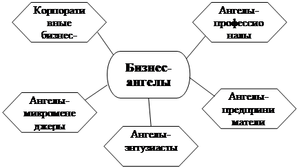 Рисунок 2 — Классификация бизнес-ангелов [22] Рассмотрим более подробно каждый тип: 1. Корпоративные бизнес-ангелы — частные инвесторы, которые используют для инвестиций средства, полученные ими в качестве компенсации при увольнении с должности топ-менеджера крупной корпорации. Руководящую должность они пытаются занять и в финансируемой компании. Участвуют они, как правило, только в одном проекте, инвестиционные ресурсы около 1 млн долл., вкладывают в проект не более 200 тыс. долл. 2. Ангелы-предприниматели. К ним относятся наиболее активные из бизнес-ангелов. Суммы вложений у них более крупные — от 200 до 500 тыс. долл. Зачастую, они успешные предприниматели, которые ищут способ оптимизировать свой инвестиционный портфель. 3. Ангелы-энтузиасты. У них меньше профессионального опыта, и инвестиции для них скорее хобби. Оперируют они небольшими суммами (от 10 до 50 тыс. долл.), инвестируют обычно в несколько компаний и ни в одной из них не участвуют в управлении. 4. Ангелы-микроменеджеры. Данные инвесторы стремятся контролировать собственные инвестиции, поэтому зачастую находятся в Совете директоров, но при этом в оперативном управлении финансируемой компанией не участвуют. 5. Ангелы-профессионалы. Это инвесторы различных профессий — врачи, аудиторы, адвокаты, которые стремятся вкладывать в те компании, продукт которых относится к их профессиональной деятельности. В таком случае инвесторы предоставляют еще и экспертную оценку, однако активно в деятельности компании не участвую. Вкладывают обычно от 25 до 200 тыс. долл., финансируя одновременно несколько проектов. Отметим основные преимущества в финансировании проектов представителями неформального рынка венчурного капитала: — бизнес-ангелам свойственна наибольшее проявление активности именно на начальной стадии реализации проектов, когда необходимы меньшие средства, при более высокой норме прибыли, однако и риски максимальны. — данные инвесторы занимают собственную нишу рынка, которая не вызывает повышенный интерес у крупных венчурных фондов по причине незначительных сумм вложений. — для бизнес-ангелов зачастую не принципиальны направление и отрасль промышленности, главным фактором выступает высокий потенциал роста. — бизнес-ангелы, в большинстве своем, имеют собственный опыт организации бизнеса, и предоставляя его вместе с инвестициями, оказывают значительную помощь молодым компаниям во всех аспектах [23]. — география распространения бизнес-ангелов значительно шире, нежели у формальных венчурных фондов. — любая компания, сумевшая привлечь бизнес-ангелов, выглядит привлекательней и для других инвесторов. Деятельность неформальных инвесторов взаимовыгодна для каждой из сторон, а порой даже расценивается как единственный путь к осуществлению идей и начинаний венчурной компании, которая еще не успела зарекомендовать себя в глазах крупных венчурных фондов.