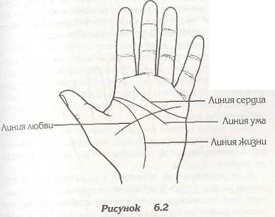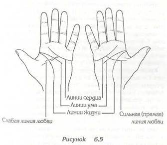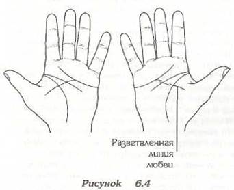 Теперь возвратимся к этому всеобъемлющему фактору — любви. На бугре Венеры начинаются линии любви. Они пересекают линию жизни и, при хороших любовных отношениях, проходят по ладони через линии сердца и ума к бугру Меркурия (см. рис. 6.2). Каждая имеющаяся у вас линия любви представляет собой любовную связь определенного вида. Абсолютно нормально, если у однолюба таких линий несколько, но я встречала семейные пары, где один из супругов приходил в ужас, узнав, что это означает. Как бы там ни было, они не говорят о горячих, страстных чувствах. Если они заканчиваются на линии ума (см. рис. 6.3), — это означает, что дружба и любовь не лидируют на эмоциональном плане, но, возможно, имеют некоторое влияние на ваши взгляды на жизнь. Если они заканчиваются на линии сердца, значит, связь затрагивает вас эмоционально, но что-то удерживает ее от того, чтобы перерасти в устойчивые отношения. Я полно описала различные виды линий любви в книге "Обретите контроль над своей жизнью", и теперь расскажу о них вкратце. Волнистые или разветвленные линии (заканчиваются ли они на линии сердца, линии ума или холме Меркурия) представляют отношения или дружбу, у которых мало оснований для дальнейшего развития (см. рис. 6.4). Если линия прямая на левой ладони, но разветвленная на правой, — это означает, что отношения имеют достаточно почвы для развития, но вы не принимаете их всерьез. Если расположение обратное, с разветвленными линиями на левой руке и прямыми на правой, — это означает, что отношения построены на слабой основе, вы рассчитываете на гораздо большее, чем они могут принести (см. рис. 6.5). Очень важно сознавать, что такие линии вовсе не всегда говорят о физической любви. На моих руках линии любви прямые, но они показывают рождение моих детей. Знакомство с моим мужем выражено прямой линией на моей руке, которая говорит об отношениях, сложившихся пять лет назад. Еще одна линия представляет лошадь, которую я купила детям. Это животное доставляет столько радостных эмоций, сколько никакие отношения с людьми не принесут; и это длится до сих пор. Ежедневно я сажусь верхом на нее, спрашивая, что я могу себе еще позволить на этой земле. Вы не убежите от правды о самом себе, когда будете смотреть на свои руки. Мы живем в такое время, когда личное преуспевание кажется нам первостепенным, а отношения между людьми рушатся во имя этого. Я слышала мнение о том, что если один партнер всецело отдается своему делу и из-за этого разрушает отношения, каждый, кого это касается (семья, друзья), впоследствии убедится, что это принесет улучшение в их жизнь. Несмотря на то, что я нахожу это иногда верным, если речь идет одновременно и о финансах, и о работе, и о любви, это вовсе не история, прочитанная по руке, которая говорит о разрушенных отношениях, при которых страдают дети.