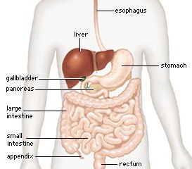 The partly digested food, called chyme, passes from the stomach into the small intestine. First, food enters the duodenum, the first part of the small intestine. It then enters the jejunum and then the ileum (the final part of the small intestine). In the small intestine, other juices complete the process of digestion. They break down the food into molecules that pass through the walls of the intestine and into the bloodstream. The blood distributes the nutrients to cells and tissues throughout the body. There the nutrients are broken down to produce energy or are used to rebuild tissues or to regulate chemical processes. Some of the nutrients are stored in the body, and others are used over and over again. But most of the nutrients undergo chemical changes as they are used in the cells and tissues. These chemical changes produce waste products, which go into the bloodstream. Some of the wastes are carried to the kidneys, which filter the wastes out of the blood. The body expels these wastes in the urine. The liver also filters out some wastes and concentrates them into a liquid called bile. Bile is stored in the gall bladder until it is needed to aid in the process of digestion. Then the gall bladder empties bile into the small intestine. From there, any remaining bile passes into the large intestine, along with those parts of the food that could not be digested in the small intestine. The liver (located under the rib cage in the right upper part of the abdomen), the gallbladder (hidden just below the liver), and the pancreas (beneath the stomach) are not part of the alimentary canal, but these organs are essential to digestion. So, after passing through the small intestine, food passes into the large intestine which consists of cecum (the appendix is connected to the cecum), colon (ascending, transverse, descending) sigmoid colon and rectum. The rectum ends in the anus. The large intestine absorbs water and small amounts of minerals from waste material. This material, along with bacteria present in the large intestine, becomes the final waste product, the feces, and it is eliminated from the body.