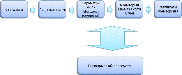 Рис. 2. – Решение задачи обеспечения качества услуг связи Как видно из рисунка 2.2 требования к перечню показателей качества услуг связи могут устанавливаться в стандартах международных организаций, таких как МСЭ, ETSI, национальных стандартах, отраслевых стандартах и других документах. Условия по поддержке качества услуг связи могут устанавливаться: в лицензионных условиях, например, Франция, Индия, Пакистан, в национальном законодательстве, например, Малайзия, Сингапур, Танзания; в отраслевых руководящих документах, например, Австралия. Методики измерений показателей качества услуг связи можно разделить на: методики измерений показателей, характеризующих работу сети связи, например, среднее время установления соединения, количество сброшенных вызовов, доля успешных вызовов, скорость соединения, доступность сети по уровню радиосигнала, доля успешно переданных сообщений SMS и пр.; методики измерений показателей, влияющих на удовлетворенность пользователей услугами связи, например, правильность начисления оплаты в счете, ошибки при выставлении счета. Мониторинг качества услуг связи осуществляется путем измерений на сети связи, которые могут опираться как на статистические данные или контрольные измерения, так и на основании опросов пользователей услугами связи и анализа поданных ими претензий. Результатами мониторинга качества услуг связи являются: сообщения регулирующего органа на Web-сайте, в пресс-релизах; публикации в средствах массовой информации; наложение административного штрафа; судебные разбирательства. Кроме этого, предусмотрена процедура пересмотра показателей качества услуг связи, методик измерений и проведения измерений. Как показывает зарубежный опыт, периодичность пересмотра осуществляется один раз в три года. Ранее, когда были распространены только сети фиксированной телефонной связи, требования к обеспечению качества налагались на операторов сетей фиксированной связи. Поскольку современные сети телефонной связи на практике стали универсальными и перешли на технологию коммутации пакетов по протоколу IP, в которых доступ к услугам связи осуществляется по сетям фиксированного и мобильного широкополосного доступа, то первоочередной задачей, которую зарубежные регулирующие органы ставят перед операторами связи, заключается в обеспечении качества услуг широкополосного доступа. Например, британский регулирующий орган в области связи Ofcom в 2008 году опубликовал новые правила «Code of Practice» для поставщиков услуг Интернета [9], согласно которым последние должны гарантировать пользователям услуг широкополосного доступа заявленные ими скорости доступа в Интернет. Данные действия Ofcom были вызваны тем, что пользователи, подписавшись на услуги доступа в Интернет, зачастую получают доступ в Интернет на скоростях ниже, чем поставщики услуг Интернета объявляют в своих рекламных кампаниях. Для того чтобы ясно представлять, какие изменения происходят на рынке услуг широкополосного доступа, Ofcom решил публиковать официальные отчеты о деятельности поставщиков услуг Интернета на всей территории Великобритании. В связи с этим регулирующий орган Ofcom проводит независимые от операторов связи исследования по определению реальных скоростей доступа в Интернет у пользователей. При этом пользователям также п