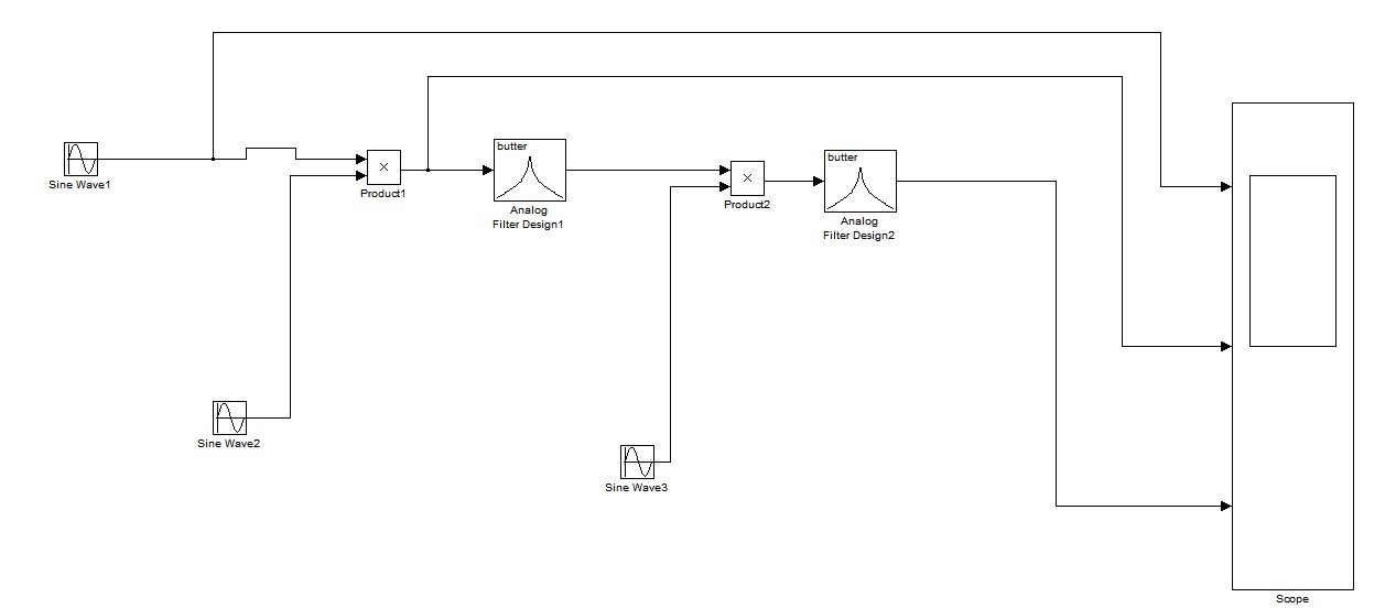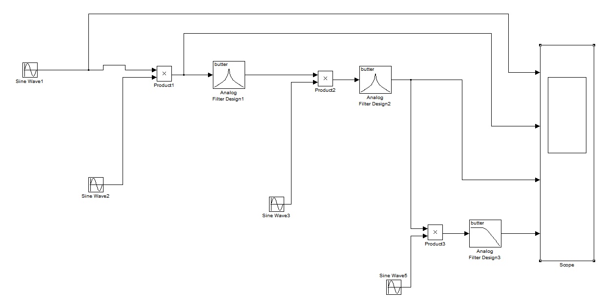 Product 1 и Product 2 – перемножители, выполняющие функцию балансных модуляторов. Analog Filter Design 1 и 2 –полосовые фильтры, для выделения верхней боковой частоты.