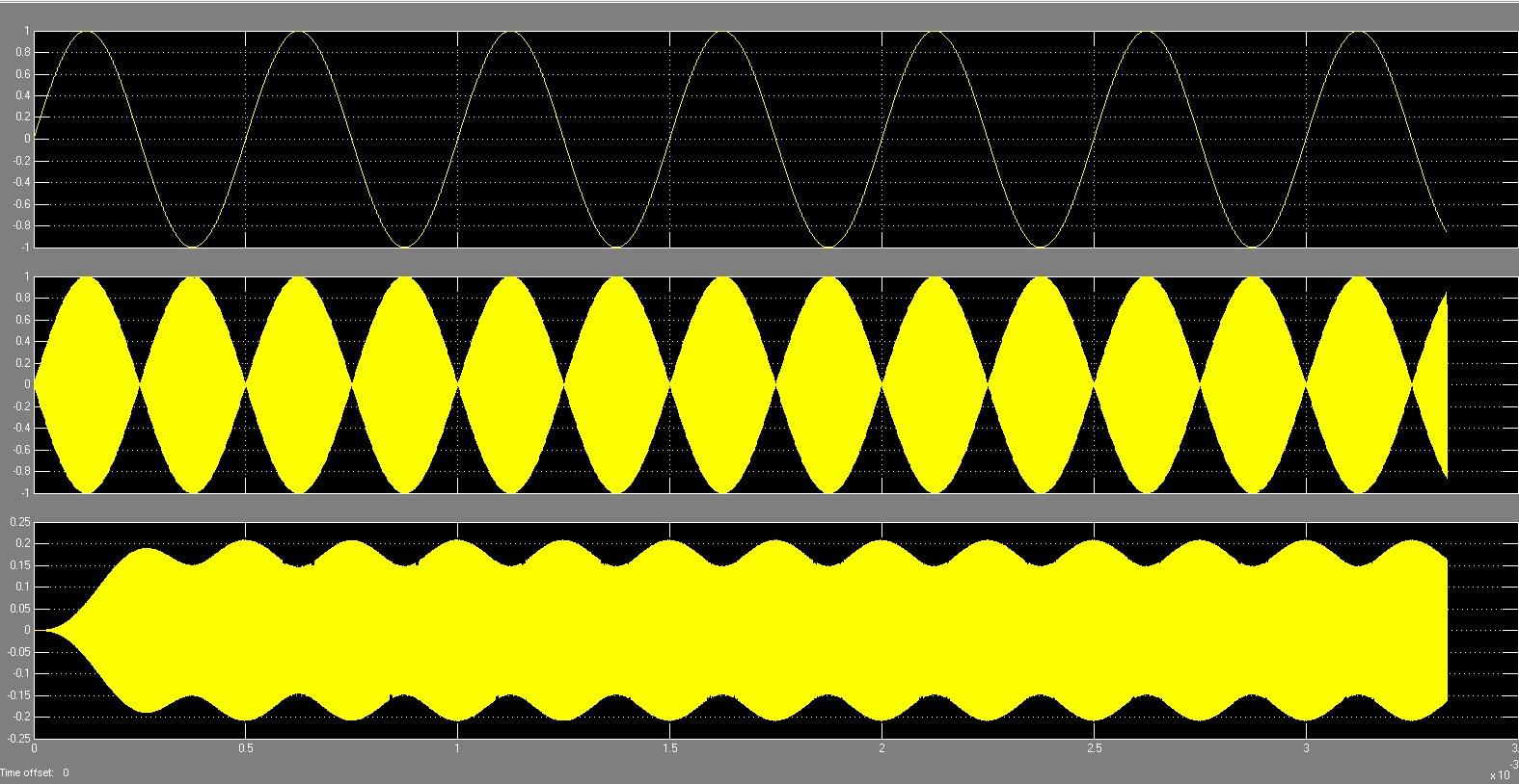 Параметры модуляции: Длительность модуляции – 10 периодов сигнала, Максимальная длительность шага модуляции – 10-7 секунд. Примечание: под термином «модуляция» понимается не процесс модуляции в понимании радиотехники, а как процесс имитации прохождения сигнала в программе Simulink. Установив все необходимые параметры, запускаем процесс модуляции. Результаты модуляции представлены на рисунке ниже:
