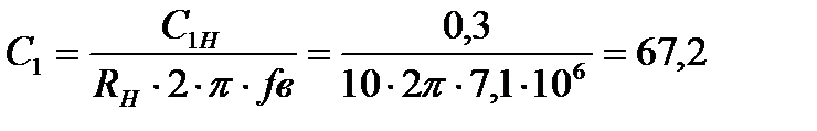где Rнор и wнор – сопротивление и частота, относительно которых производится нормировка, L, C, R – значения нормируемых элементов Lн, Cн, Rн – нормированные значения. Нормируем Свых (относительно Rн и wв) в соответствии с (19) СвыхН = Свых×Rн×wв =5,1×10-12×40×2p×7,1×106=22,74*10-6 В таблице 7.1 [4] находим нормированные значения L1 и С1, соответствующие найденному СвыхН. Ближайшее значение СвыхН= 0,285, ему соответствуют: С1Н= 0,3 L1Н =0,547 n =1,002. Денормирование элементов производится по следующим формулам:
