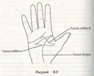 Проверьте свой палец Солнца или третьи фаланги всех своих пальцев (см. гл. 3), чтобы проверить, далеко ли вы продвинулись в своем успехе. Если нет, работа над упражнениями по достижению благосостояния предоставит вам возможность добиться успеха. Линии любви, которые заканчиваются на равнине Марса, имеют аналогичное значение (см. рис. 8.5а). Но, к разочарованию всех, имеющих такой рисунок, ваши отношения вряд ли продолжатся. Также они свидетельствуют о том, что вы стали очень динамичным человеком и разблокируете многие свои стороны, открыв глаза навстречу новым возможностям как в любви, так и в творчестве. У моей близкой подруги был такой рисунок на левой руке, но на правой линии любви были прямые и четкие, проходящие полностью до бугра Меркурия. Правая Рука говорила о том, что она рассматривала свои теперешние отношения со своим другом как состоявшиеся. Она очень любила его, называла это великой любовью, любовью всей своей жизни. Он был немного младше ее, другого вероисповедания, и его семья его крепко держала. В результате, любовь закончилась, рассеяв ее желание изменить вероисповедание и сделать для него все.